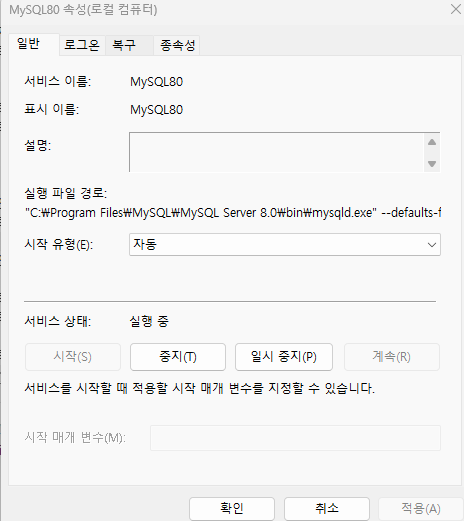 MySQL80을 찾아서 속성을 자동으로 바꿔주고 실행을 시킨다.