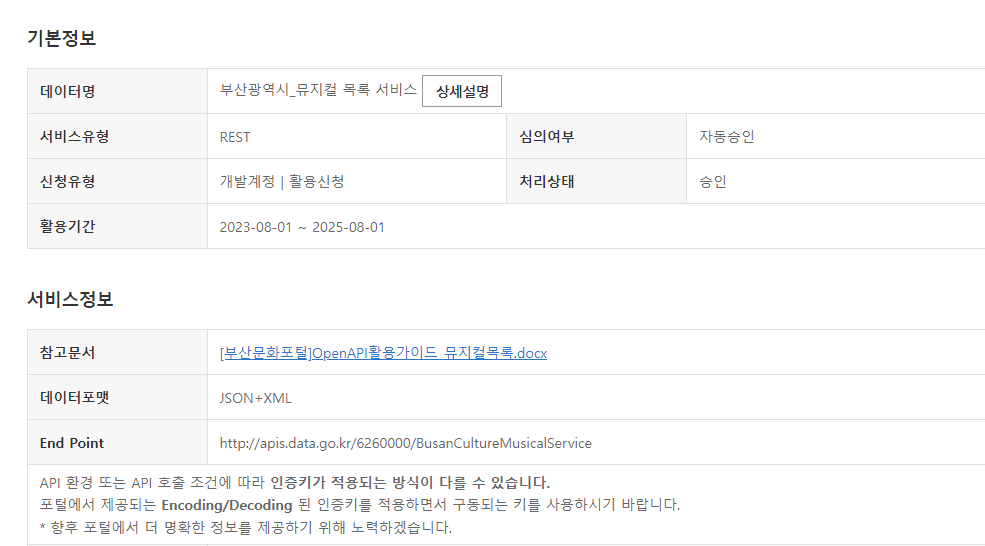 일단 공공데이터포탈에 접속을 합니다. 원하는 제목의 오픈 API에 들어가서 활용신청을 해주세요 저는 부산광역시_뮤지컬 목록 서비스을 했어요. 활용신청을 하는건 간단해요 원하는 API에 들어
