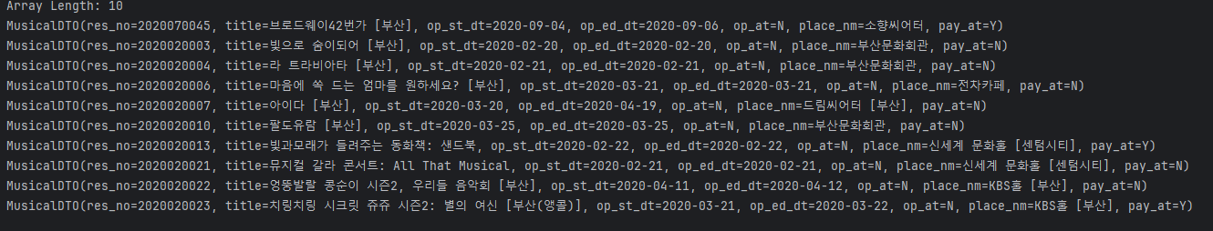 이제 저는 10가지의 뮤지컬 정보가 JSONArray 안에 들어가있어요.